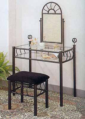 Sunburst Design Black Finish Metal Vanity Table Mirror and Stool/Bench Set. This is a brand new Sunburst Design black finish metal vanity set. Item is designed with two clear glass shelves, mirror and matching stool/bench. Beautify your bedroom with this vanity set that adds elegance to your decor. Item is designed to perfection and crafted to be practical and stylish in decor for your home furniture. Item may require simple assembly. Dimensions Measure: Vanity - 34"W x 19 1/4"D x 55"H, Stool/Bench - 18"W x 13 1/2"D x 17"H.../ Coaster Vanity Set includes, Vanity Table, Mirror and Bench, Sunburst Design, Black Finish Metal / Stool And Chairs